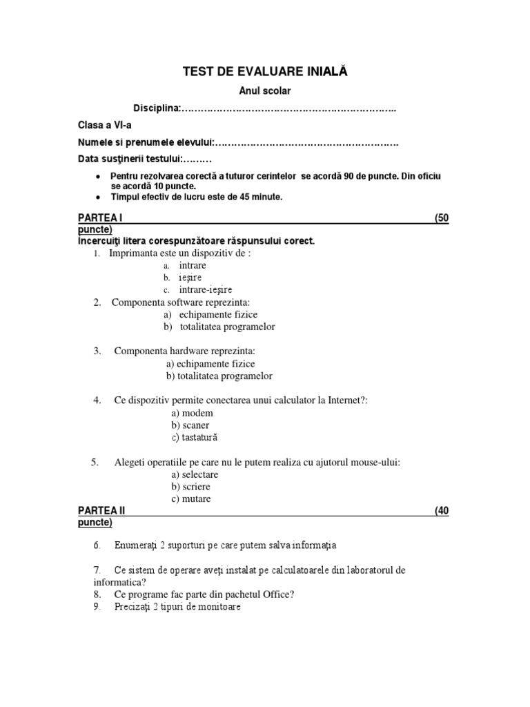 Test initial clasa a ix a fizica. Pentru clasele a ix a a a ix a c2 si a ix ad test de evaluare clasa a x a contine testul si baremul de corectare interpretarea rezultatelor aici. Teste inițiale pentru elevii de clasa a viii a au fost publicate de ministerul educației la materiile la care nu există încă manuale din cauza eșecului licitației. 1 septembrie 2014 11 39.