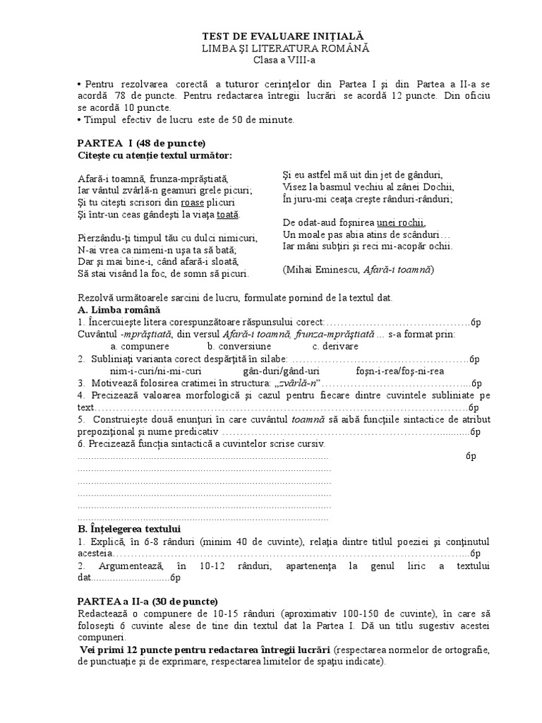 Test Initial Romana Clasa 8
