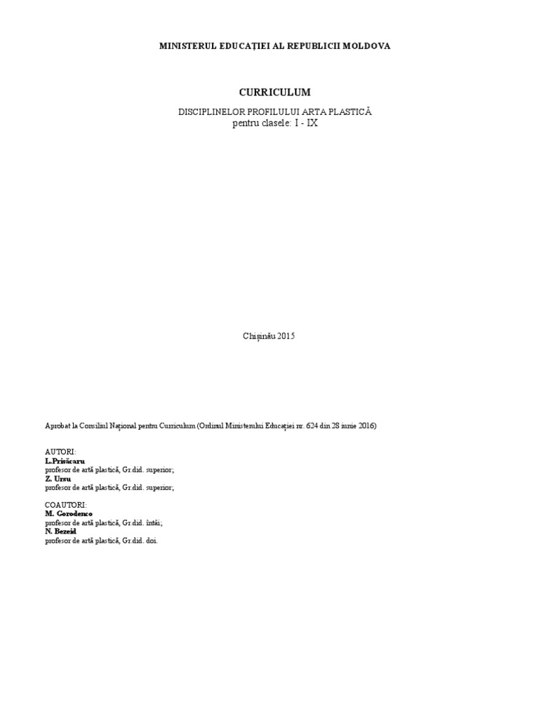 Curriculum Pentru Clasele Cu Profil Arte Plastice Clasele I Ix