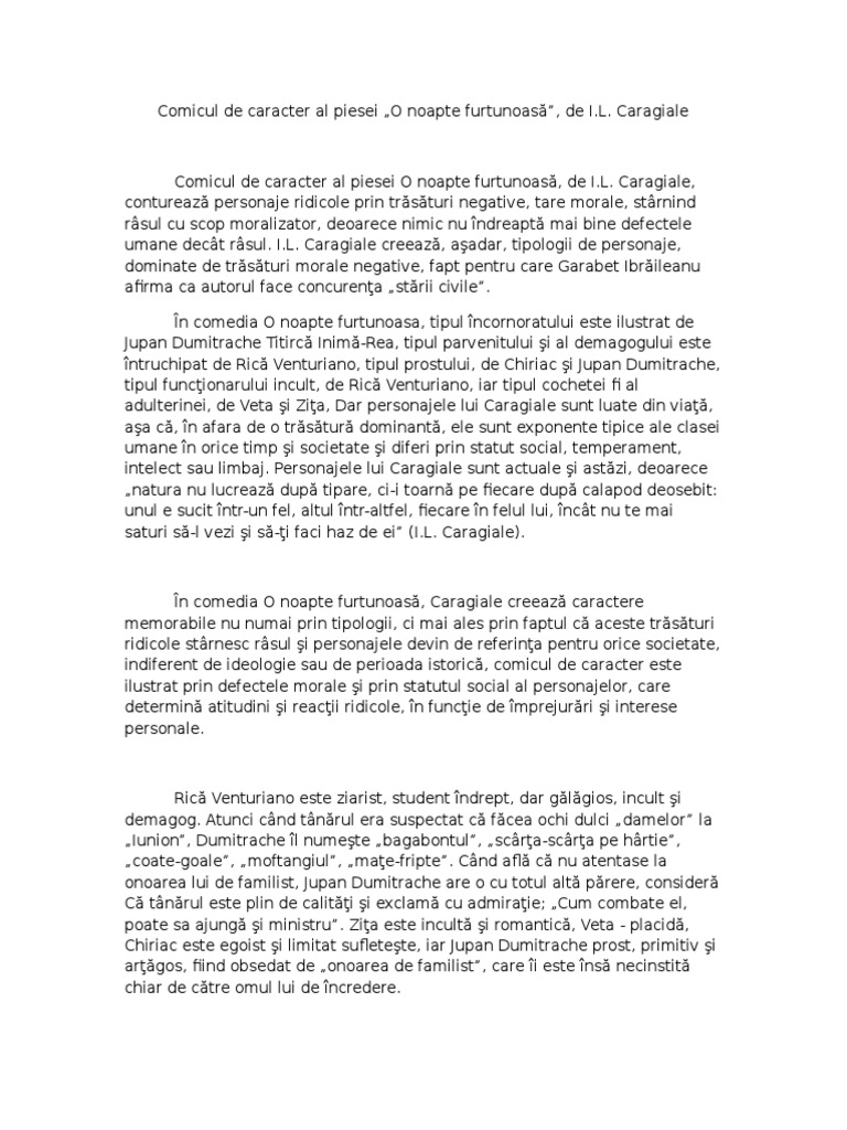 Comicul De Caracter Al Piesei O Noapte Furtunoasă De I L Caragiale