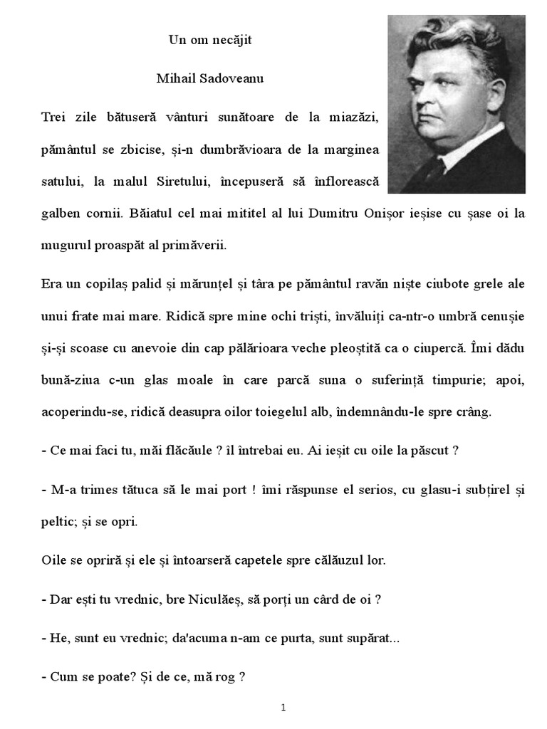 Salvare salvați un om nacajit mihail sadoveanu pentru mai târziu. Un om necăjit este o povestire al cărei autor este scriitorul mihail sadoveanu. Baiatul cel mai mititel al lui dumitru onisor iesise cu sase oi la mugurul proaspat al primaverii. 57 21 57 au considerat acest document util.