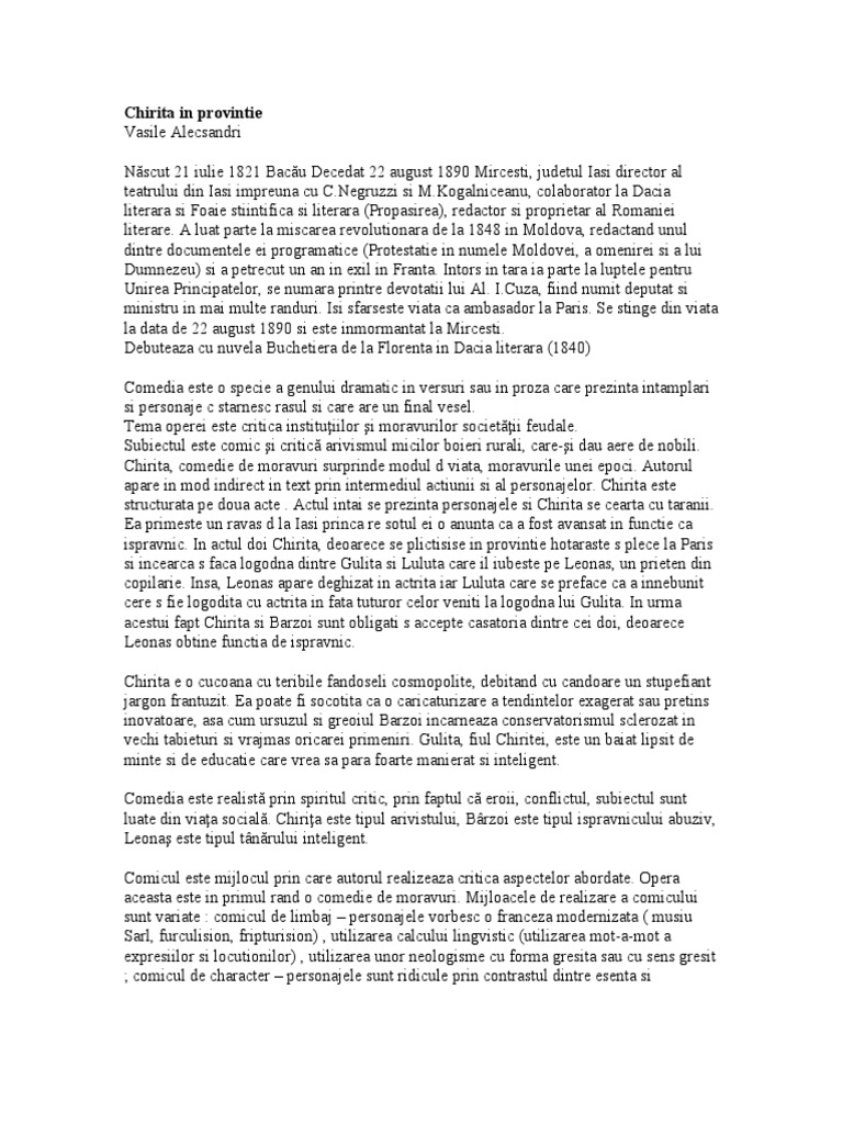 Vasile Alecsandri Chirita In Provincie Prezentare Generala